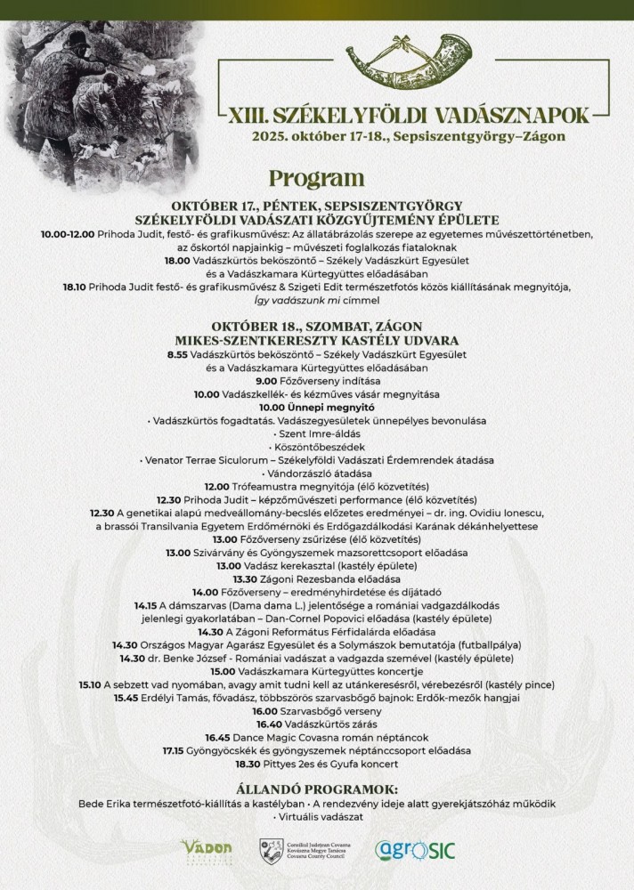 A vadásznapok pénteken, Sepsiszentgyörgyön a Székelyföldi Vadászati Közgyűjtemény épületében kezdődnek: 10 órakor Prihoda Judit, festő- és grafikusművész tart művészeti foglalkozást fiataloknak, 18 órakor a Székely Vadászkürt Egyesület és a Vadászkamara Kürtegyüttes előadásában Vadászkürtös beköszöntőt hallhatnak az érdeklődők. Ezt követően Prihoda Judit festő- és grafikusművész, valamint Szigeti Edit természetfotós Így vadászunk mi című közös kiállításának megnyitójára kerül sor.